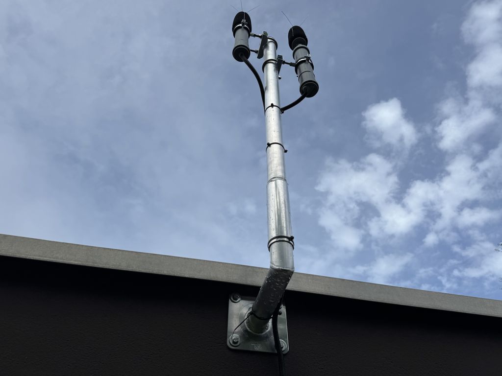 Die Mikrofone der Messstationen in Egelsbach-Bayerseich: vorne rechts DFLD und sensor.community, im Hintergrund das am Schiebemast befestigte Mikrofon der Gemeinnützigen Umwelthaus GmbH (siehe roter Kreis)